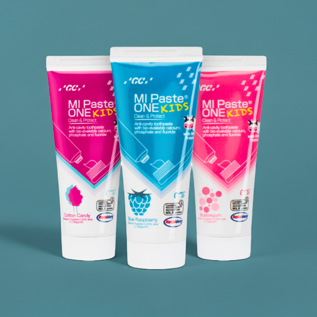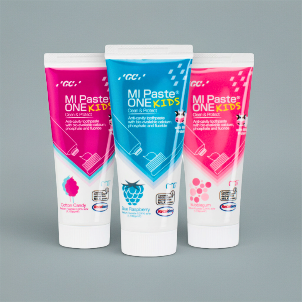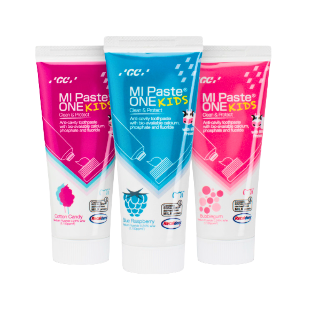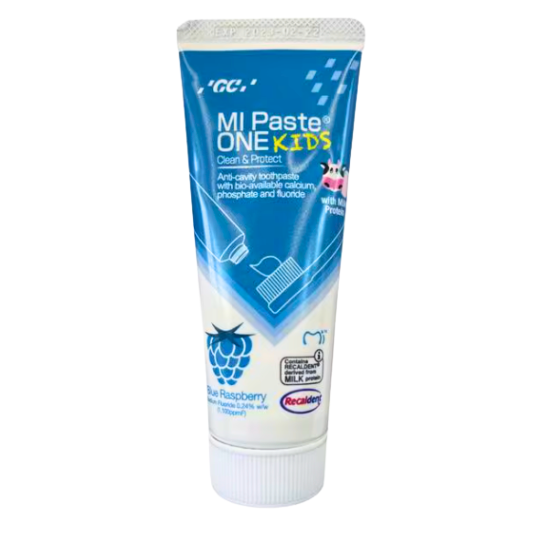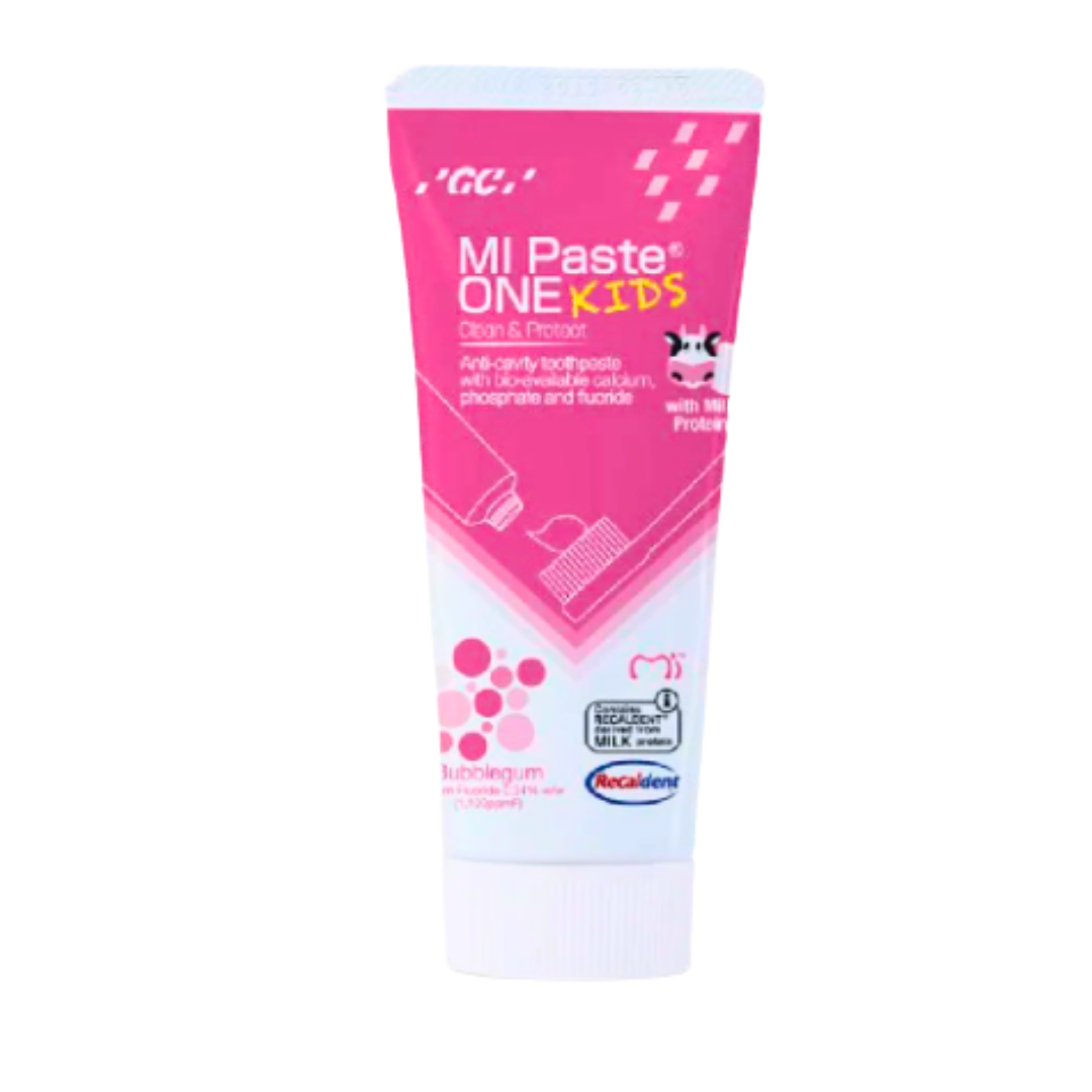 MI Paste ONE Kids ofrece los beneficios clínicos de la línea MI Paste, adaptados para los más pequeños. Su fórmula contiene Recaldent™ (CPP-ACP) y flúor para fortalecer el esmalte infantil, prevenir la aparición de caries y reducir la sensibilidad dental desde edades tempranas.
